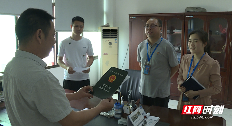 桃江县经济开发区规划建设局副局长廖雅璐把办好的《建设工程规划许可证》送到了益阳市红星机械设备有限公司董事长王建强的手中。