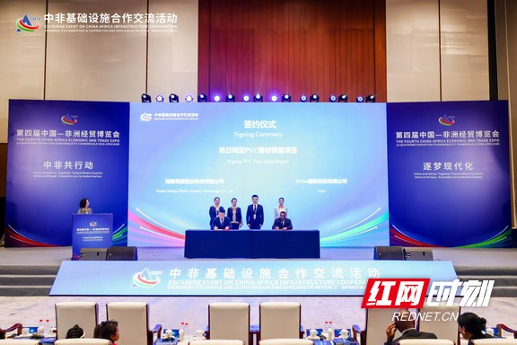 红网时刻新闻6月12日益阳讯(记者 姚宇超 实习记者 陈泽林 张志成)6月12日,第四届中非经贸博览会在长沙国际会议中心举行。在中非基础设施合作交流活动上,明塑管业(非洲)有限公司与尼日利亚FEIYA公司完成尼日利亚PVC管材生产销售项目签约。